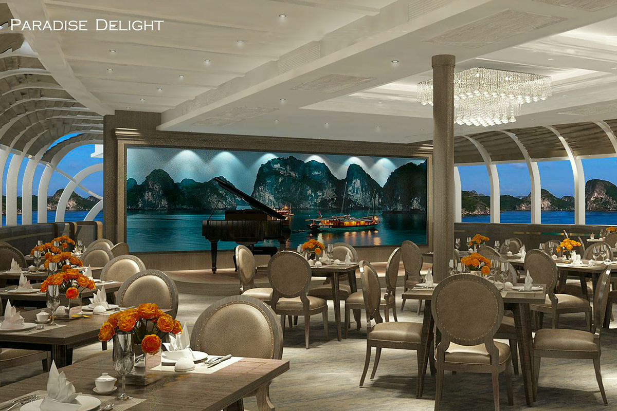 Du thuyền Paradise Delight Hạ Long là du thuyền nhà hàng đầu tiên phục vụ tiệc buffet và thực đơn gọi món thượng hạng trên Vịnh Hạ Long. Với du thuyền Paradise Delight, du khách có thể chọn cho mình hải trình 11h-14h với bữa ăn tự chọn trong không gian rực rỡ ánh sáng với toàn cảnh 360 độ hướng ra vịnh biển; hoặc ngắm hoàng hôn tận hưởng vẻ đẹp thành phố Hạ Long về đêm với hải trình 18h-22h. Tiệc buffet hải sản hơn 200 món tại không gian tầng một của du thuyền, set menu riêng tư sang trọng tại không gian tầng hai, bên cạnh đó không thể không kể đến màn biểu diễn cocktail từ những người pha chế hàng đầu. Siêu du thuyền nhà hàng Paradise Delight sẽ đến cho khách những trải nghiệm độc đáo trên vịnh Hạ Long!