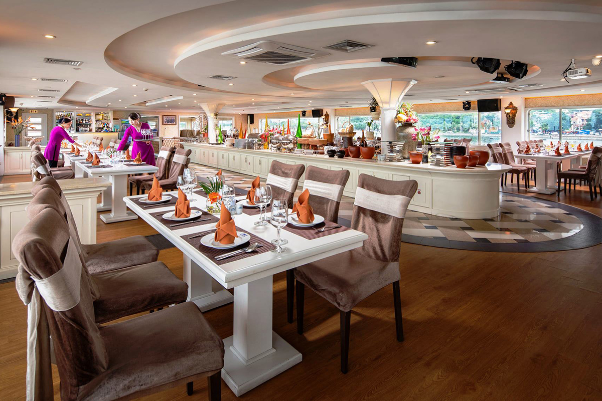 11:25 - 12:30 Ăn tự chọn trên du thuyền, thưởng thức nhạc sống truyền thống Việt Nam & quốc tế. Trong khi thưởng thức bữa ăn tự chọn, du thuyền khởi động đến hòn Gà Chọi (hòn Trống Mái) và ngắm cảnh trên đường trở về.